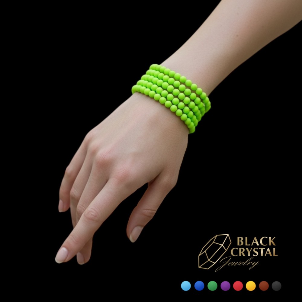 Ta bransoletka taneczna z matowych półpereł została zaprojektowana specjalnie z myślą o tancerkach niższych klas tanecznych oraz dzieciach, które nie mogą używać błyszczących ozdób. Dzięki matowemu wykończeniu spełnia wymogi regulaminowe, a jednocześnie subtelnie podkreśla styl i estetykę stroju tanecznego.