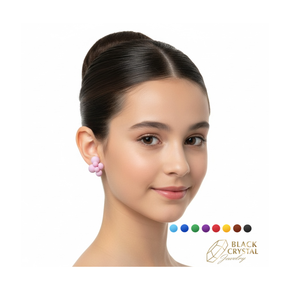 Matowe kolczyki z półpereł przeznaczone dla juniorek i niższych klas tanecznych. Zgodne z przepisami – bez połysku, nie odbijają światła. Dostępne w wielu kolorach oraz z dwoma rodzajami zapięć: B i C.