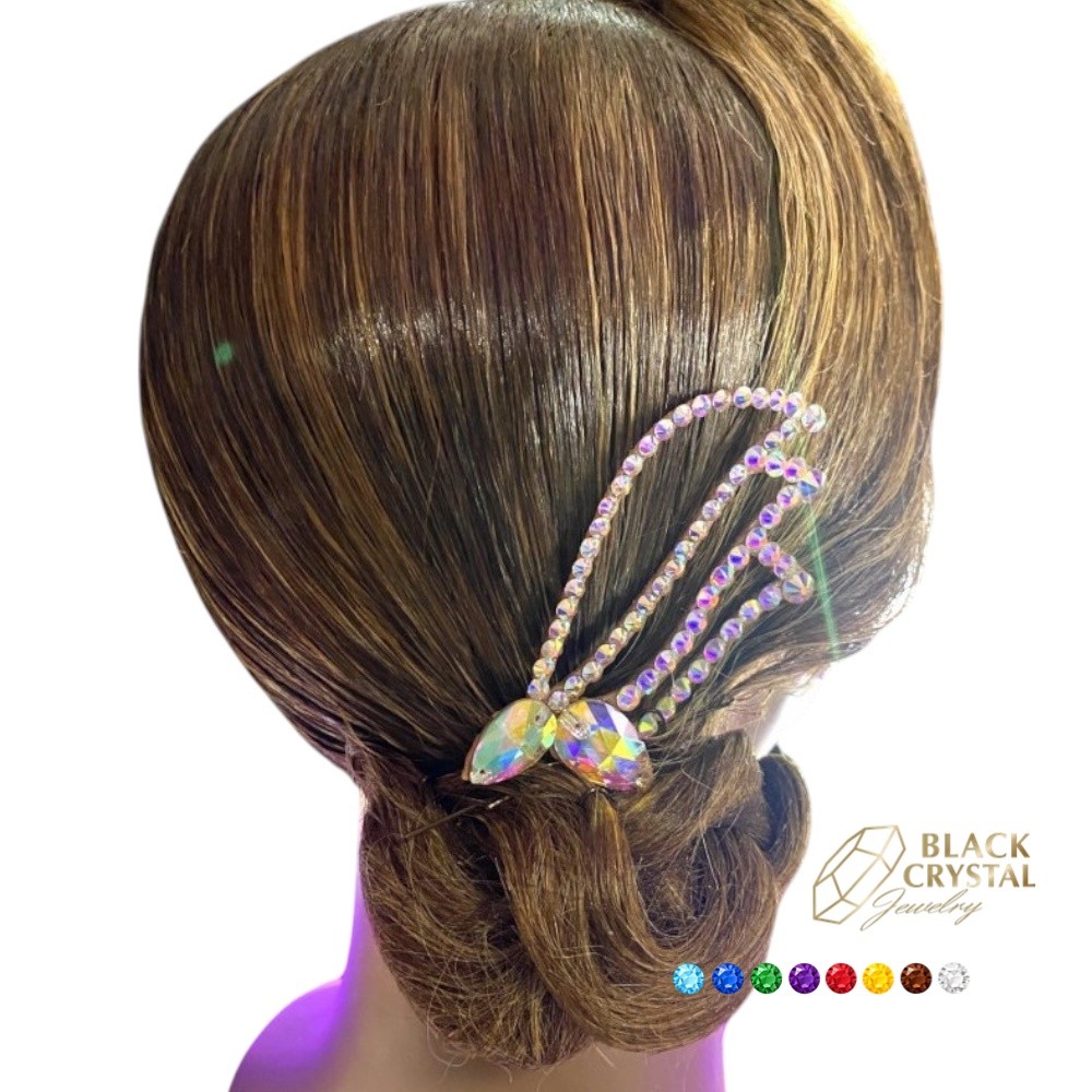 Elegancka ozdoba do włosów z kryształkami zaprojektowana specjalnie dla tancerek. Subtelna, a jednocześnie efektowna forma pięknie podkreśla fryzurę i dodaje stylizacji scenicznego blasku. Dostępna w różnych wersjach kolorystycznych.